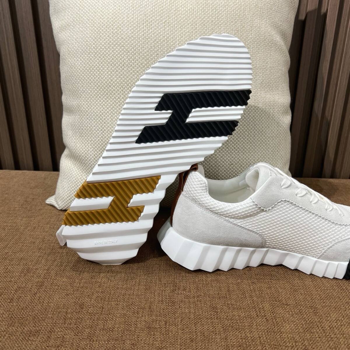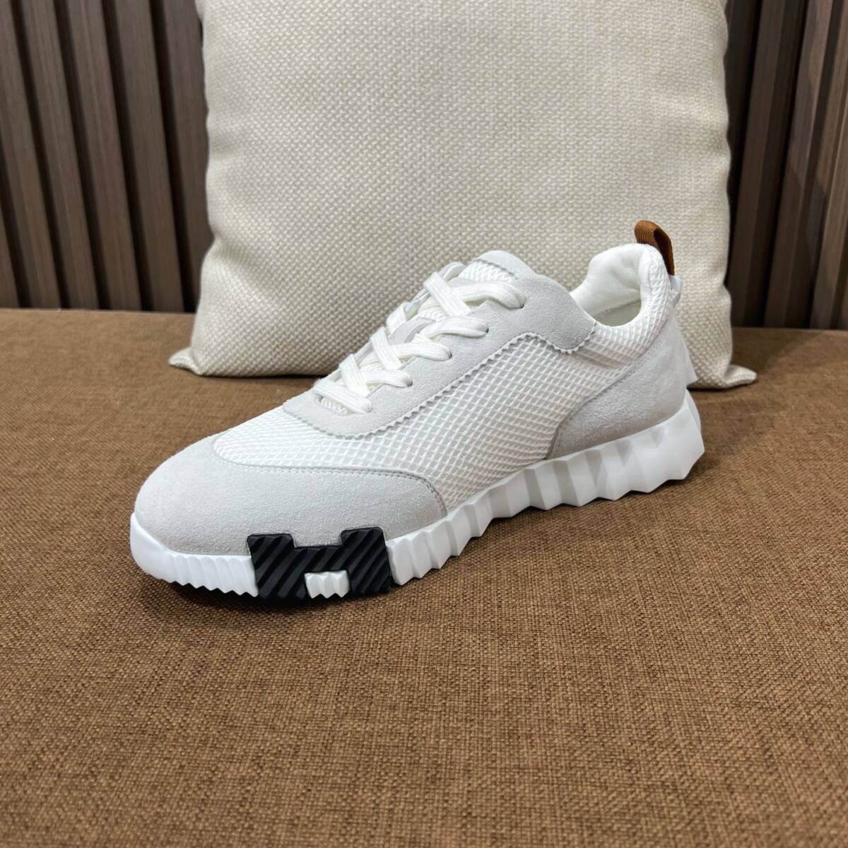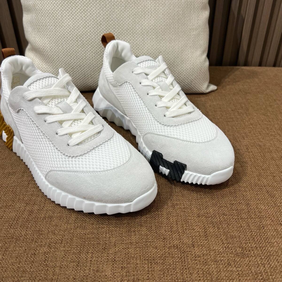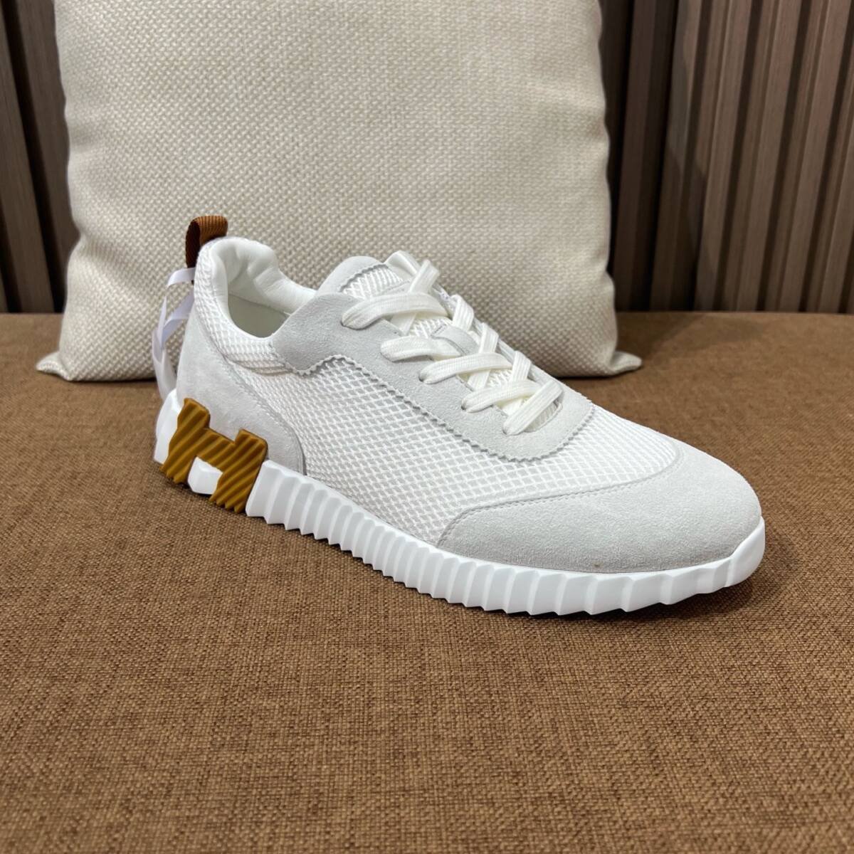 Hermxs elevates athleisure with grey and white mesh-suede Bouncing sneakers, blending sporty comfort and timeless elegance.